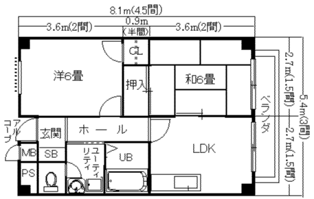 畳が6枚敷いてある部屋。畳の大きさはまちまち。鉄筋コンクリートの建物は、壁が厚くなるため木造や鉄骨造に比べ小さい場合が多い。 近年建築された物は部屋の大きさに合わせて畳を作る場合が多い。 賃貸情報誌等には京間(191×95.5cm)、江戸間(176×68cm)、中京間(182×91cm)と説明されている物も見られるが、現在では殆んど使用されていない。 畳は水に弱い。普段の手入れは掃除機や乾いた雑巾で掃除すれば良い。水等で濡れた場合すぐに拭いておかないと、畳の裏側にカビが生えることが有る。 図面に戻る↑ |